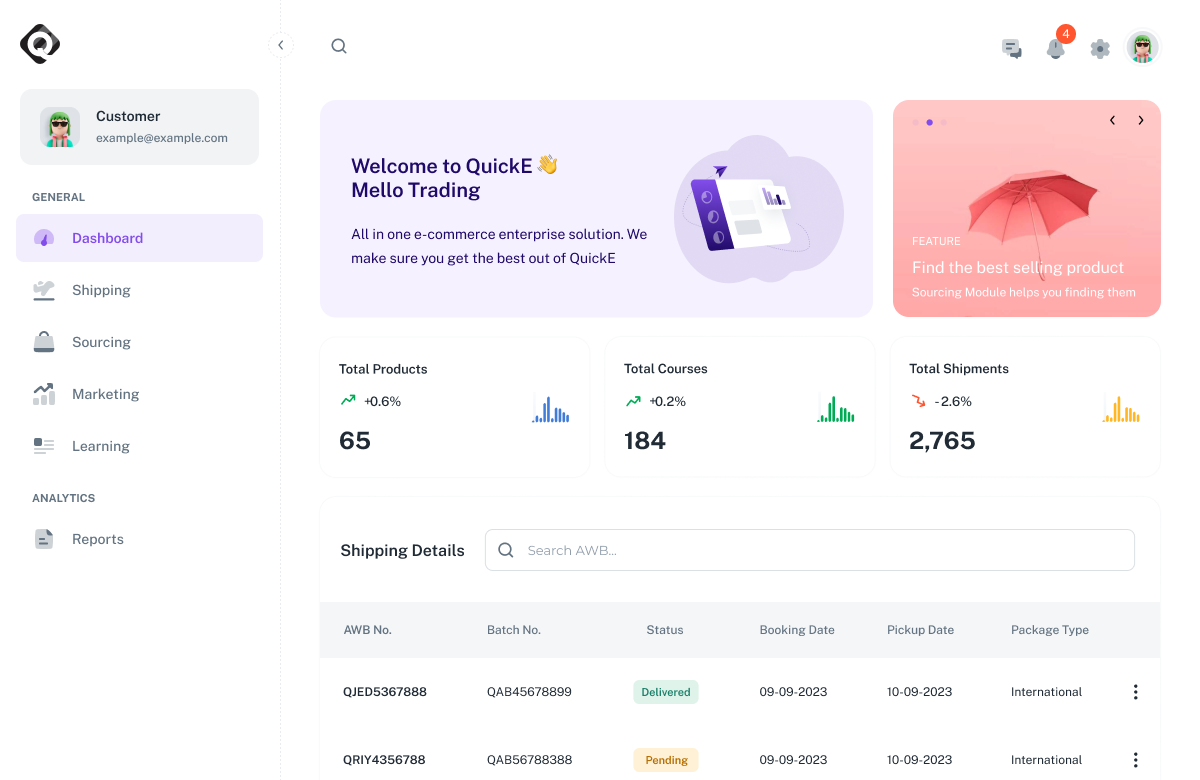 QuickE is like a Digital Road that made you to choose the right products, Marketing techniques and shipping process.